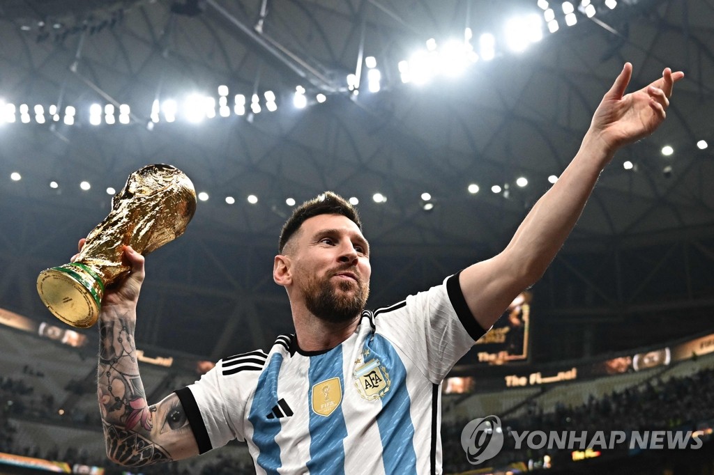 | ▲ '라스트 댄스'로 월드컵 트로피 손에 쥔 아르헨 메시 (도하 AFP=연합뉴스) 아르헨티나 축구대표팀 주장 리오넬 메시가 18일(현지시간) 카타르 루사일 스타디움에서 열린 2022 카타르 월드컵 결승전에서 프랑스를 상대로 승리를 거둔 뒤 트로피를 손에 쥔 채 기뻐하고 있다. 메시는 이번 카타르 대회가 마지막 월드컵이라고 예고한 바 있다. 이날 아르헨티나는 연장전까지 3-3으로 프랑스에 맞선 뒤 승부차기에서 4-2로 이겨 우승을 차지했다. 2022.12.19 ddy04002@yna.co.kr |