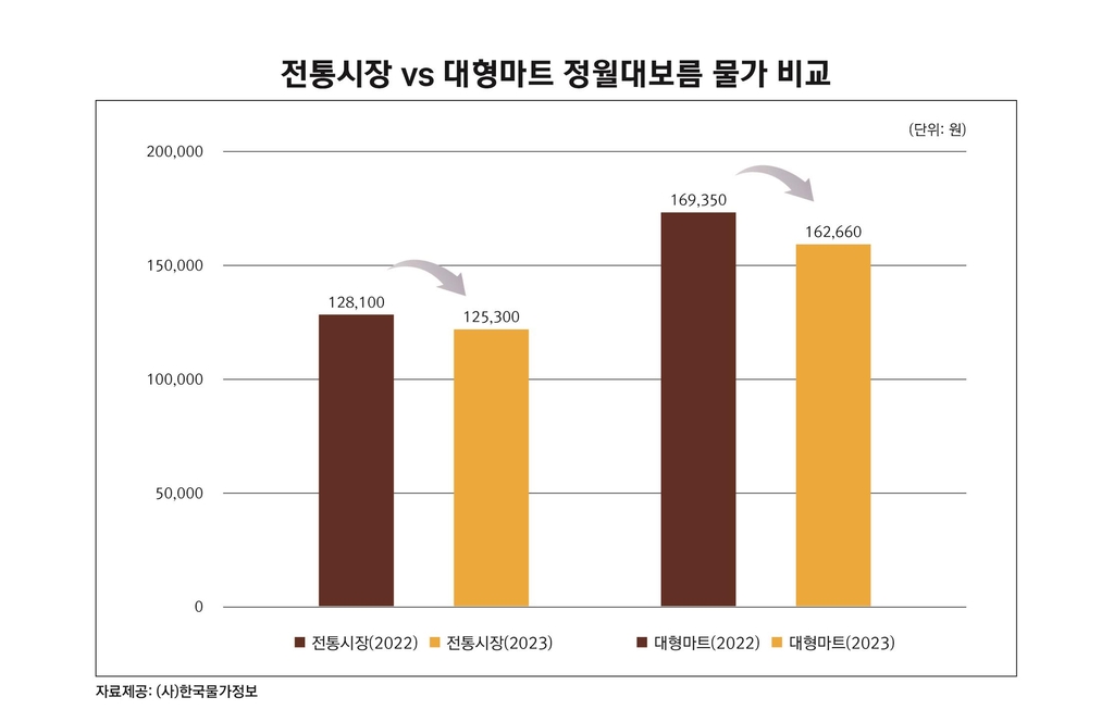 전통시장 구매 가격은 지난해보다 2.2%, 대형마트는 4% 저렴했다.