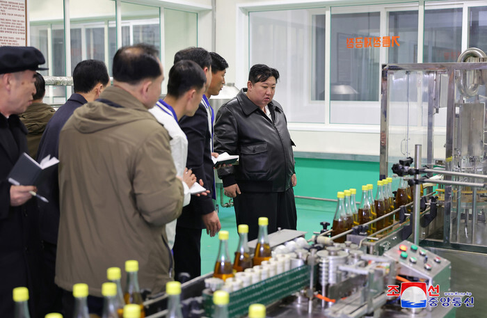 North Korean leader Kim Jong-un (R) inspects a foodstuff factory in Kimhwa, the North's Kangwon Province, on Feb. 7, 2024, as part of efforts to learn about the modernization and management of the regional industrial factories in the region, in this photo released the next day by the North's official Korean Central News Agency. (For Use Only in the Republic of Korea. No Redistribution) (Yonhap)