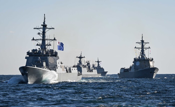 Naval warships take part in fleet-level maritime drills in the East Sea on Nov. 10, 2025, as the Navy conducted its first fleet-level maneuver drills in the southern and eastern seas, involving three Aegis-equipped destroyers and four other warships, to mark its 80th founding anniversary, in this photo provided by the Navy. (PHOTO NOT FOR SALE) (Yonhap)