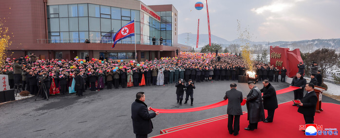 North Korean leader Kim Jong-un (C, on stage) attends a tape-cutting ceremony marking the completion of a new paper mill in Unsan, South Phyongan Province, western North Korea, on Dec. 28, 2025, in this photo released by the North's official Korean Central News Agency the next day. The Unsan mill is among the factories completed under Kim's regional development policy. In January last year, he ordered the building of modern factories in 20 cities and counties each year over a 10-year period to improve the living conditions of people in regional areas. (For Use Only in the Republic of Korea. No Redistribution) (Yonhap)