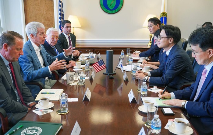 South Korean Industry Minister Kim Jung-kwan (2nd from R) holds talks with U.S. Energy Secretary Chris Wright (2nd from L) during their meeting in Washington, D.C., on July 23, 2025, in this photo released by the South Korean industry ministry. (PHOTO NOT FOR SALE) (Yonhap)