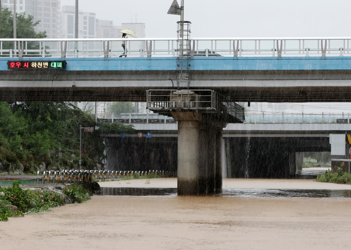 This photo, taken Aug. 13, 2025, shows a swollen stream in Seoul's Seodaemun Ward following torrential rain that hit the region. (Yonhap)
