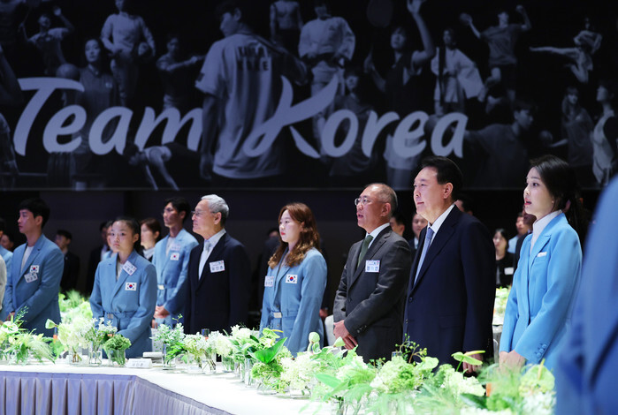 President Yoon Suk Yeol (2nd from R) and his wife, Kim Keon Hee (R), sing the national anthem during an event to applaud the South Korean national team for their showing at the Paris Olympics at a hotel in Seoul on Aug. 22, 2024. (Pool photo) (Yonhap)