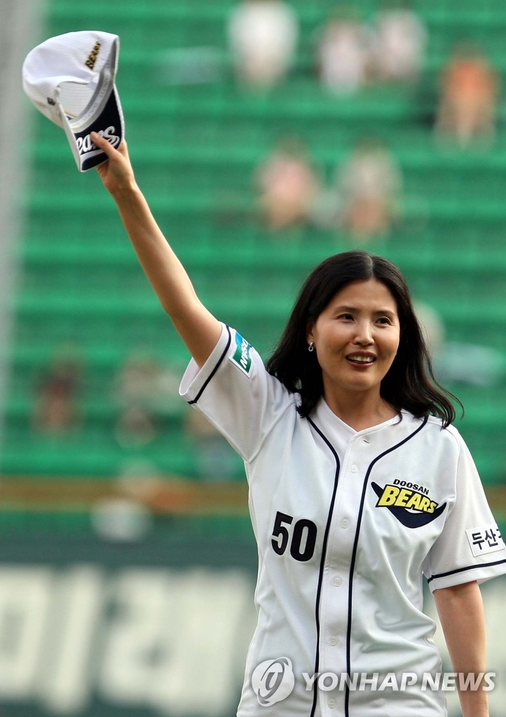 | ▲ 2009년 7월 잠실야구장에서 시구한 뒤 관중에게 인사하는 최영미 [연합뉴스 자료사진] |