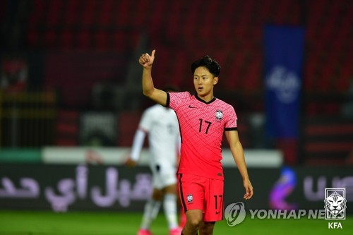 ▲ Lee Seung-woo of South Korea gives a thumbs-up sign against Egypt during their under-23 men's football friendly match at Al Salam Stadium in Cairo on Nov. 12, 2020, in this photo provided by the Korea Football Association. (PHOTO NOT FOR SALE) (Yonhap)