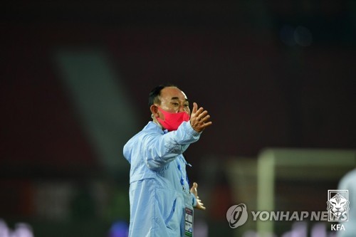 ▲ Kim Hak-bum, head coach of the South Korean men's under-23 football team, directs his players in a friendly match against Egypt at Al Salam Stadium in Cairo on Nov. 12, 2020, in this photo provided by the Korea Football Association. (PHOTO NOT FOR SALE) (Yonhap)