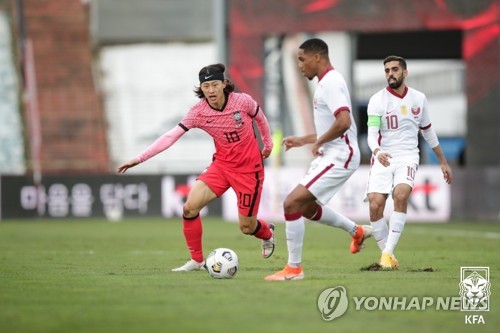 ▲ Lee Jae-sung of South Korea (L) dribbles the ball against Qatar during the teams' football friendly match at BSFZ Arena Admiral Stadium in Maria Enzersdorf, Austria, on Nov. 17, 2020, in this photo provided by the Korea Football Association. (PHOTO NOT FOR SALE) (Yonhap)