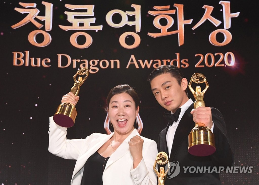 | ▲ This photo, provided by The Sports Chosun, shows Ra Mi-ran (L) and Yoo Ah-in winning best actress and best actor, respectively, at the 41st Blue Dragon Awards held at Paradise City in Incheon, 40 km west of Seoul, on Feb. 9, 2021. (PHOTO NOT FOR SALE) (Yonhap) |