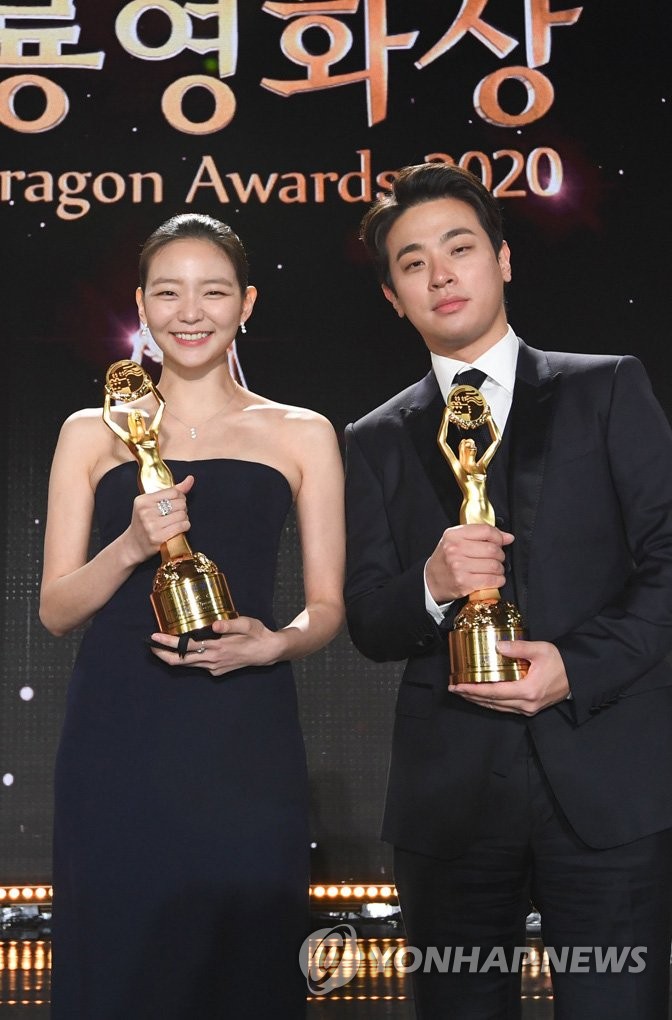 | ▲ This photo, provided by The Sports Chosun, shows Esom (L) and Park Jung-min winning best actors in supporting roles at the 41st Blue Dragon Awards held at Paradise City in Incheon, 40 km west of Seoul, on Feb. 9, 2021. (PHOTO NOT FOR SALE) (Yonhap) |