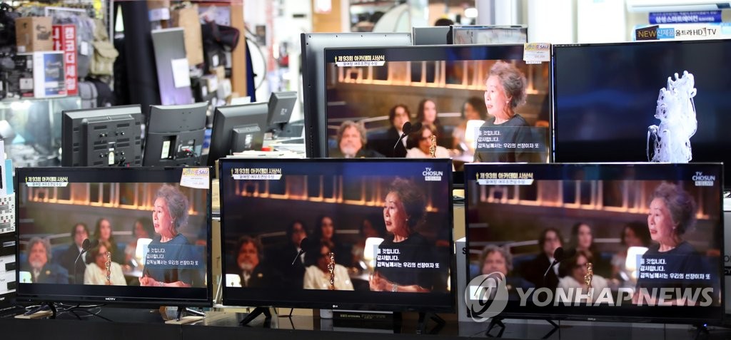 | ▲ TV 매장에 나오는 윤여정 여우조연상 수상 모습 (서울=연합뉴스) 박동주 기자 = 26일 오전 서울 용산구 전자랜드 TV 매장에 배우 윤여정이 제93회 아카데미 시상식에서 여우조연상을 받는 모습이 나오고 있다. 2021.4.26 pdj6635@yna.co.kr |