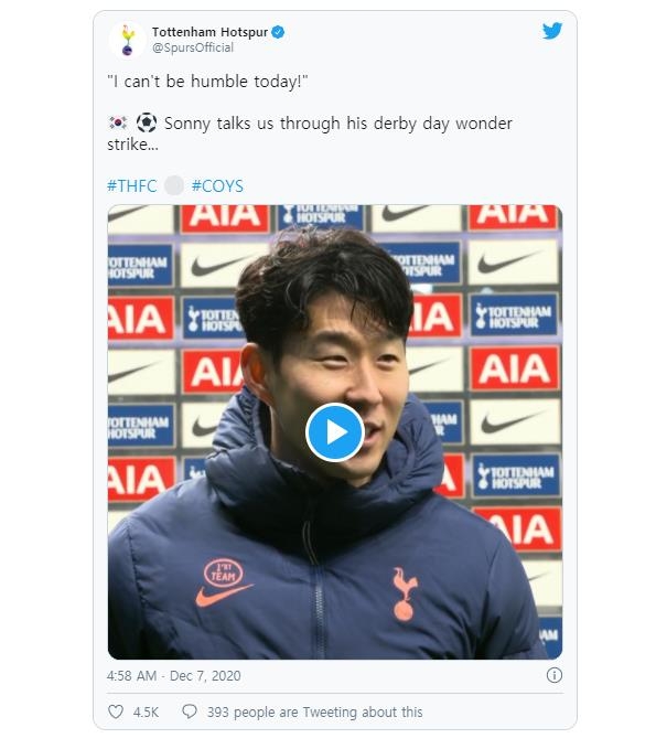 손흥민은 경기 후 구단 SNS에 실린 인터뷰에서 먼저 '대단한 골이었다'는 말에 잠시 머뭇거리다 "오늘은 겸손할 수가 없겠다"며 웃어 보였다.