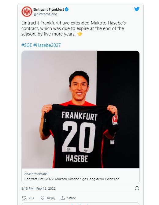하세베도 이날 자신의 사회관계망서비스(SNS)에 프랑크푸르트와 계약 연장 소식을 전했다.