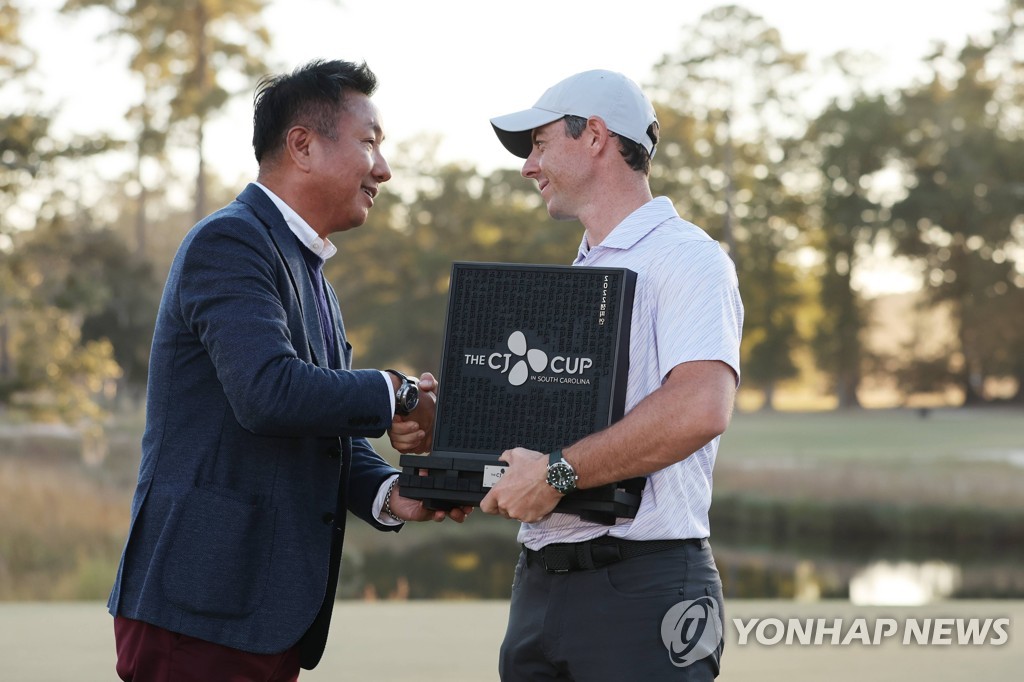 | ▲ 더 CJ컵 우승 트로피를 받는 매킬로이(오른쪽) [AFP=연합뉴스] |