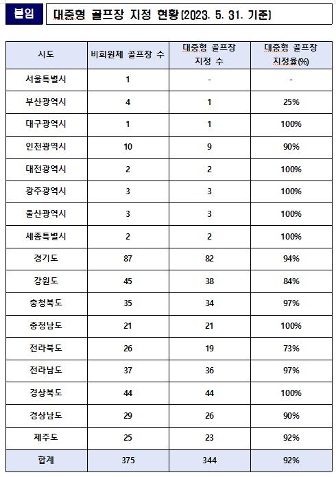 전국 대중형 골프장 지정률 92%…7개 광역 지자체는 100%