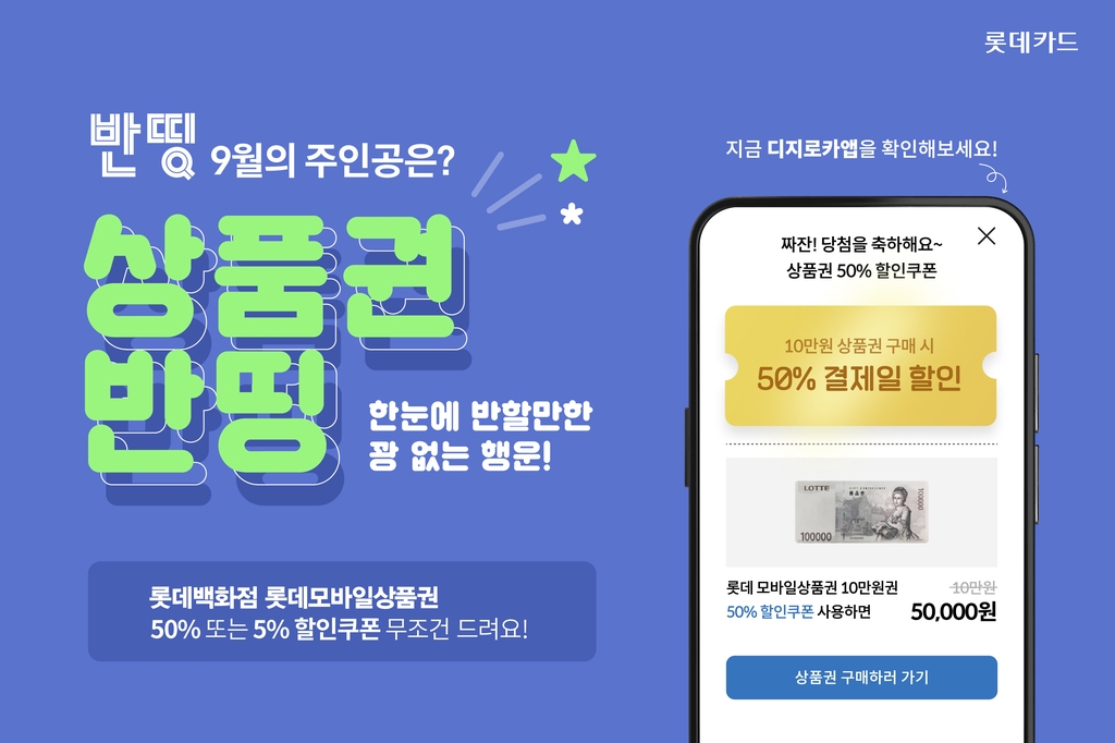 [게시판] 롯데카드, 디지로카앱서 '상품권 반띵' 행사▲ 롯데카드는 '디지로카' 앱에서 상품권 50% 할인쿠폰을 추첨해 증정하는 '상품권 반띵' 이벤트를 연다. 매월 15일부터 월말까지 상품권 50% 또는 5% 할인쿠폰 중 하나를 실시간 추첨해 증정하는 이벤트다. 9월은 롯데백화점 롯데모바일상품권이 대상이다. (서울=연합뉴스)(끝)
