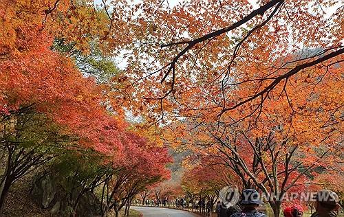 (정읍=연합뉴스) 완연한 가을로 접어든 5일 전북 정읍시 내장산 단풍이 절정에 이르러 관광객들의 눈길을 사로잡고 있다.