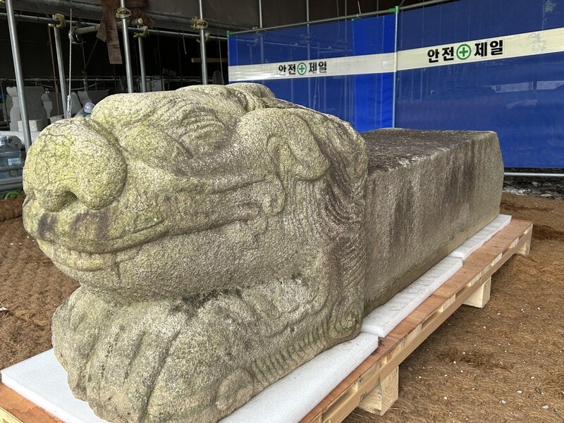 | ▲ '이것이 광화문 서수상' (서울=연합뉴스) 류영석 기자 = 29일 오후 서울 경복궁에 광화문 월대의 가장 앞부분을 장식한 서수상으로 추정되는 조각들이 놓여 있다. 이날 문화재청은 고 이건희 삼성그룹 선대 회장 유족 측으로부터 이 석조각 2점을 기증받았다고 밝혔다. 2023.8.29 ondol@yna.co.kr |