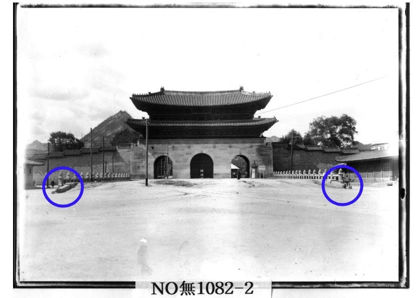 | ▲ 광화문 월대 소맷돌 모습을 찍은 유리건판 파란색으로 표시한 부분은 서수상 위치를 나타낸 것. 다만 이 사진은 1910년대 서수상 위치가 달라진 뒤 찍은 것으로 추정된다. [국립중앙박물관 제공. 재판매 및 DB 금지] |