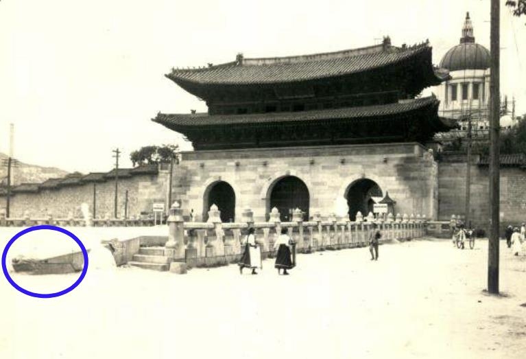 | ▲ 광화문 월대 소맷돌 모습을 찍은 사진 파란색으로 표시한 부분은 서수상 위치를 나타낸 것. 다만 이 사진은 1910년대 서수상 위치가 달라진 뒤 찍은 것으로 추정된다. [국사편찬위원회 제공. 재판매 및 DB 금지] |