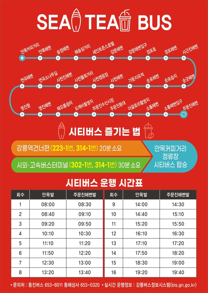 기존 시내버스와 동일한 요금으로 매일 오전 8시부터 40분마다 1일 16회를 운영해 다양한 시간대에 시민과 관광객이 편하게 이용할 수 있도록 안목발과 주문진해변발 왕복 배차를 한다.