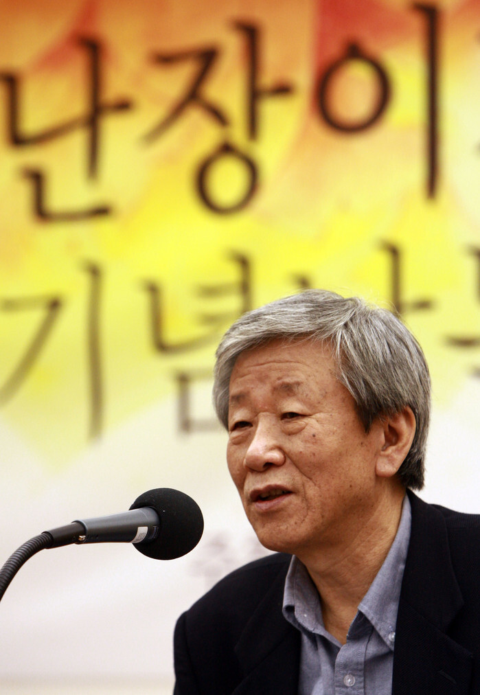 This file photo shows South Korean author Cho Se-hui speaking during an event to mark the 30th anniversary of his work "A Dwarf Launches a Little Ball" in Seoul in November 2008. Cho died of a chronic disease at 80 in Seoul on Dec. 27, 2022. (Yonhap)