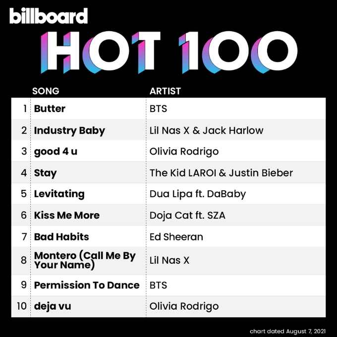 | ▲ This image, shared on Billboard's official Twitter account, shows this week's Billboard Hot 100 chart. BTS secured the No. 1 spot on the Billboard main singles chart with "Butter" on the chart dated Aug. 7, 2021. (PHOTO NOT FOR SALE) (Yonhap) |