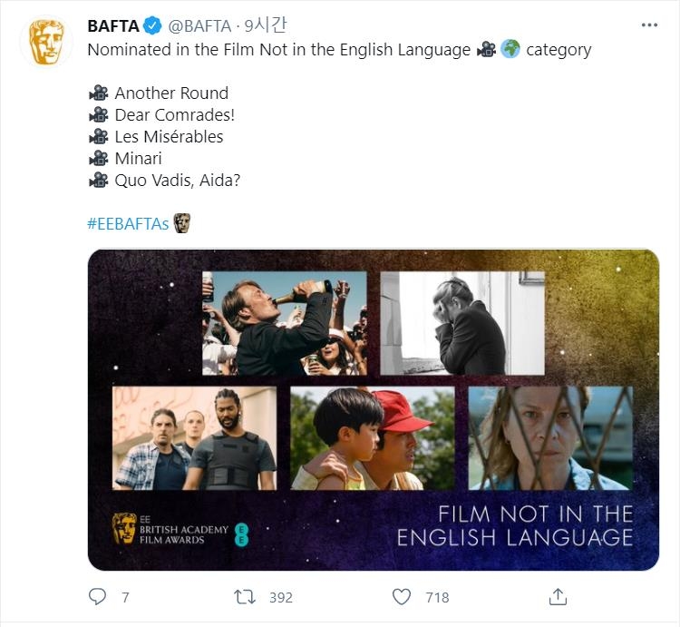 | ▲ This image from the Twitter account of BAFTA shows the nominees for the Film Not in the English Language. (PHOTO NOT FOR SALE) (Yonhap) |