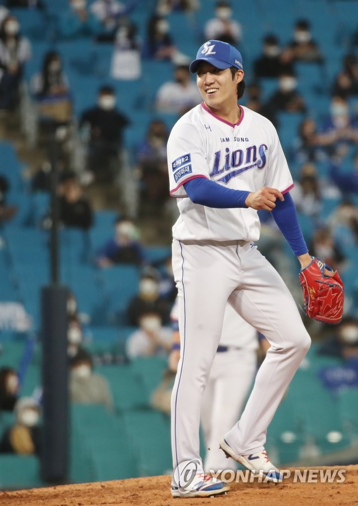 | ▲ In this file photo from April 30, 2021, Won Tae-in of the Samsung Lions smiles on the mound during the top of the seventh inning of a Korea Baseball Organization regular season game against the LG Twins at Daegu Samsung Lions Park in Daegu, 300 kilometers southeast of Seoul. (Yonhap) |