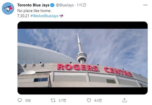 토론토 구단은 17일(한국시간) "거의 2년 만에 홈 캐나다로 돌아간다"며 "캐나다 연방정부가 '메이저리거의 국경 통행 예외 조항'을 승인했다. 우리는 매우 강력하고 안전한 방역 조치를 하며 로저스센터에서 메이저리그 경기를 치를 것"이라고 발표했다.