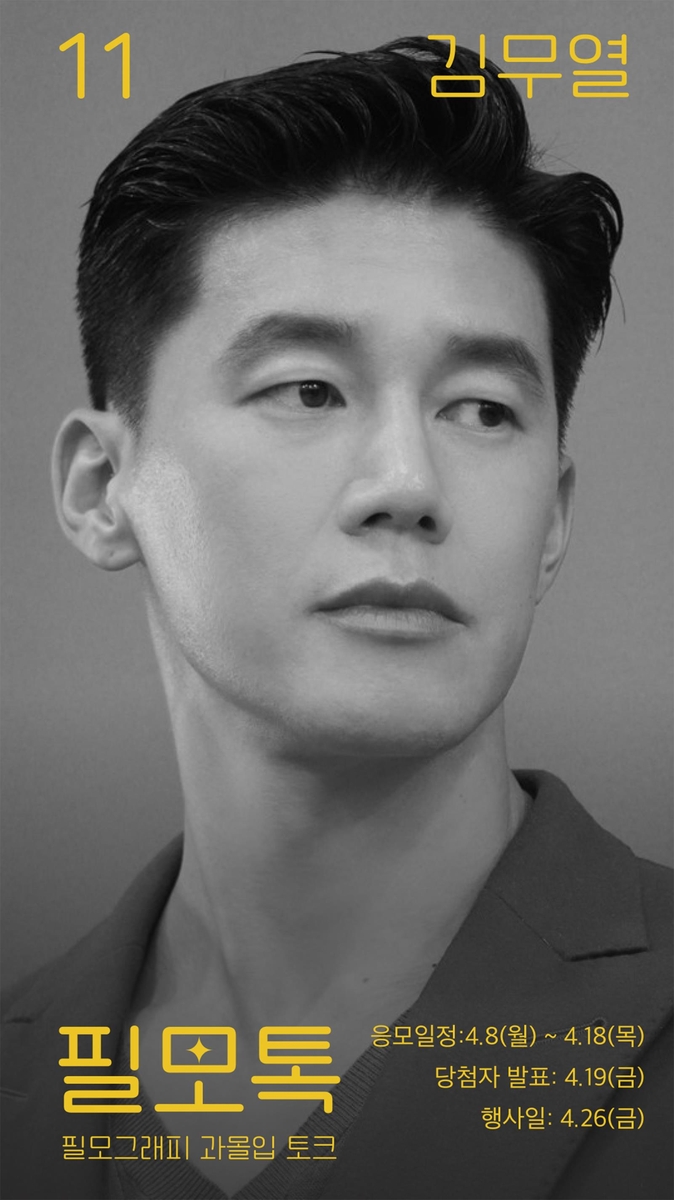 ▲ SK브로드밴드는 B tv 고객과 배우의 오프라인 만남인 '필모톡 위드(with) 김무열' 행사를 오는 26일 서울 홍대 T팩토리에서 연다고 8일 밝혔다. 김무열은 최근 영화 '범죄도시4' 악역으로 기대를 모으고 있다. 김무열은 '범죄도시4' 외에도 '은교', '기억의 밤', '악인전', '나쁜녀석들: 악의 도시', '대외비' 등 출연작에 대한 뒷이야기를 들려줄 예정이다. 현장에서는 영상 자막과 수어 통역도 함께 제공된다. 참가 신청은 오는 18일까지 B tv 홈 화면과 모바일 B tv 이벤트 페이지, 인스타그램 이벤트 계정(@conssert_btv), T팩토리 홈페이지에서 하면 된다. (서울=연합뉴스)