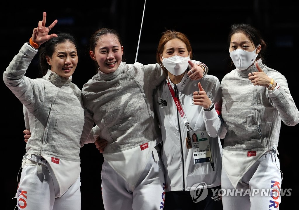 ▲ [올림픽] '우리가 해냈어' (지바=연합뉴스) 손형주 기자 = 한국 여자 펜싱 사브르 대표팀(김지연, 윤지수, 최수연, 서지연)이 31일 일본 마쿠하리메세홀에서 열린 도쿄올림픽 펜싱 여자 샤브르 단체 동메달 결정전 이탈리와 경기에서 승리한 뒤 기뻐하고 있다. 올림픽 여자 사브르 단체 종목에서 한국 대표팀이 메달을 딴 것은 이번이 처음이다. 2021.7.31 handbrother@yna.co.kr