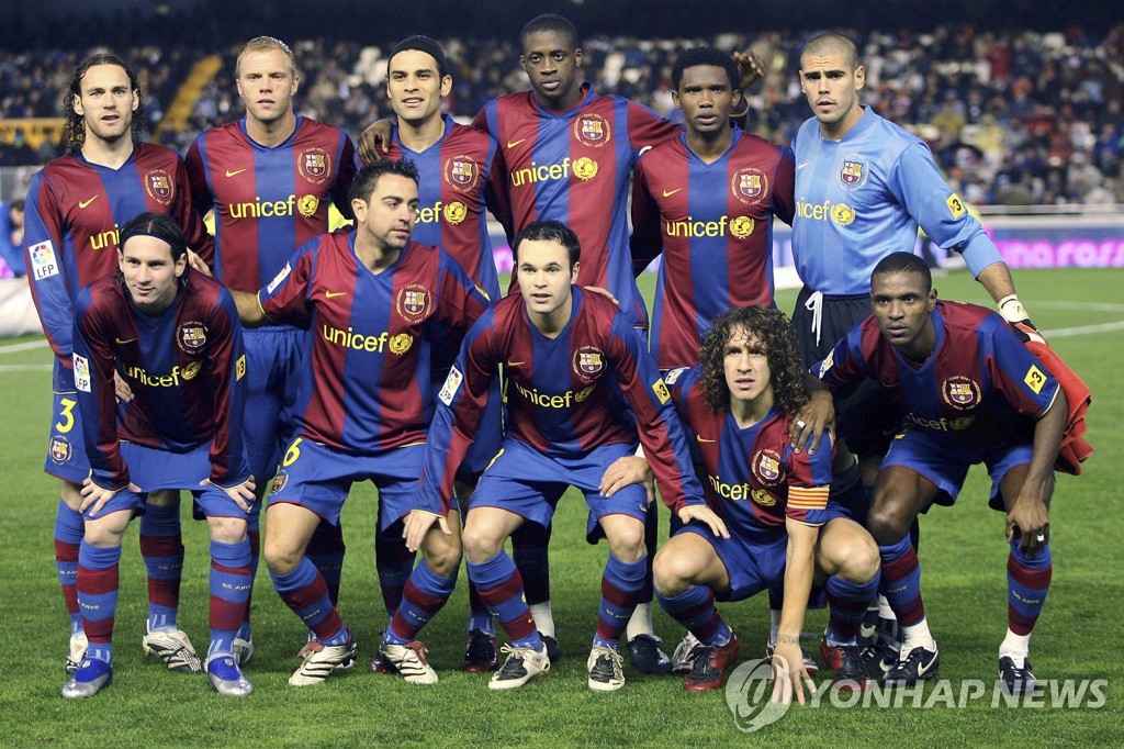 | ▲ 메시(아래 줄 가장 왼쪽)와 바르셀로나 전성기 누린 사비(아래 줄 왼쪽에서 두 번째) [AP=연합뉴스] |