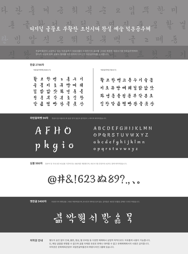 이어 "덕온공주체는 대부분의 무료 글꼴과 달리 옛 한글을 지원한다"며 "별도로 승인받지 않아도 상업 목적의 인쇄·출판·영상 등에 자유롭게 사용할 수 있다"고 덧붙였다.