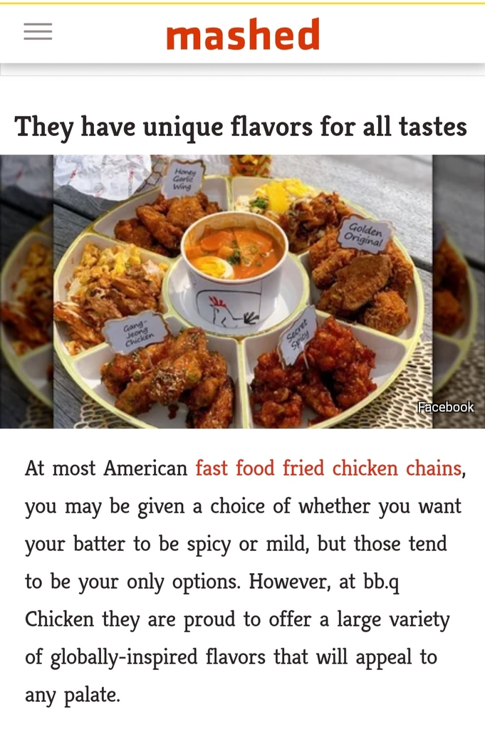 (서울=연합뉴스) 박상돈 기자 = 제너시스BBQ는 자사가 미국 음식 전문지 '매쉬드(Mashed)'에 한류 열풍과 함께 최근 성장하는 한국 브랜드로 소개됐다고 16일 밝혔다.