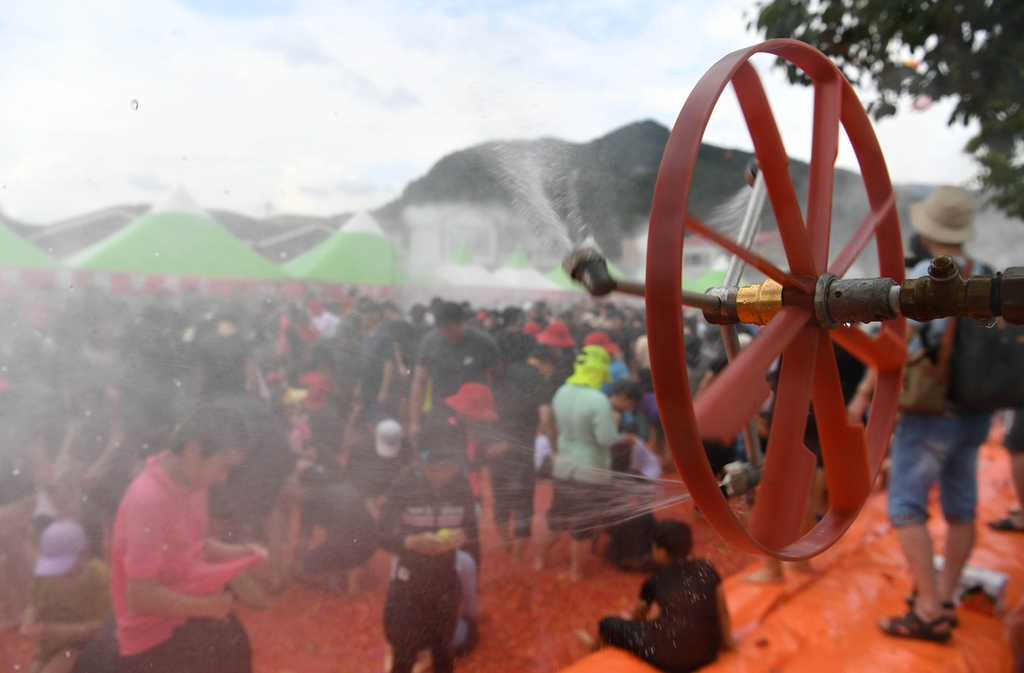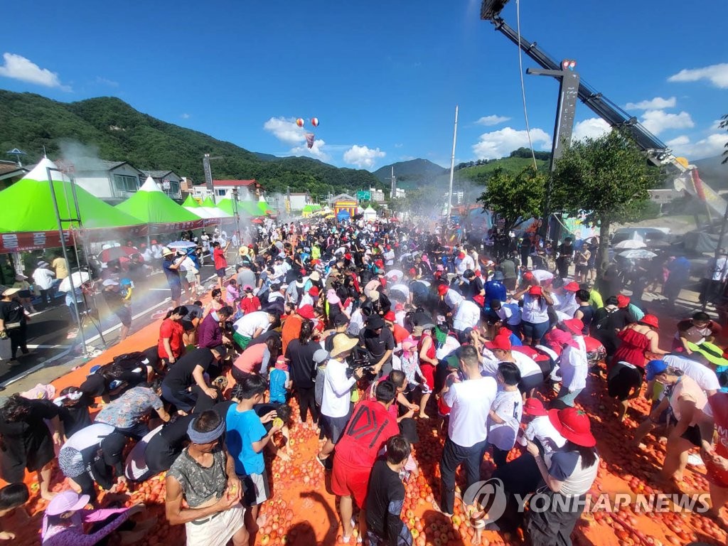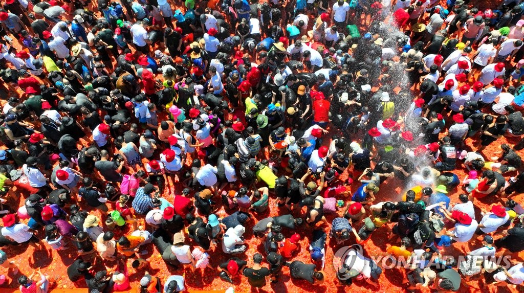 매회 1천여명 안팎의 관광객들이 토마토의 붉은 바다에 몸을 던지는 이색 체험을 했다.
