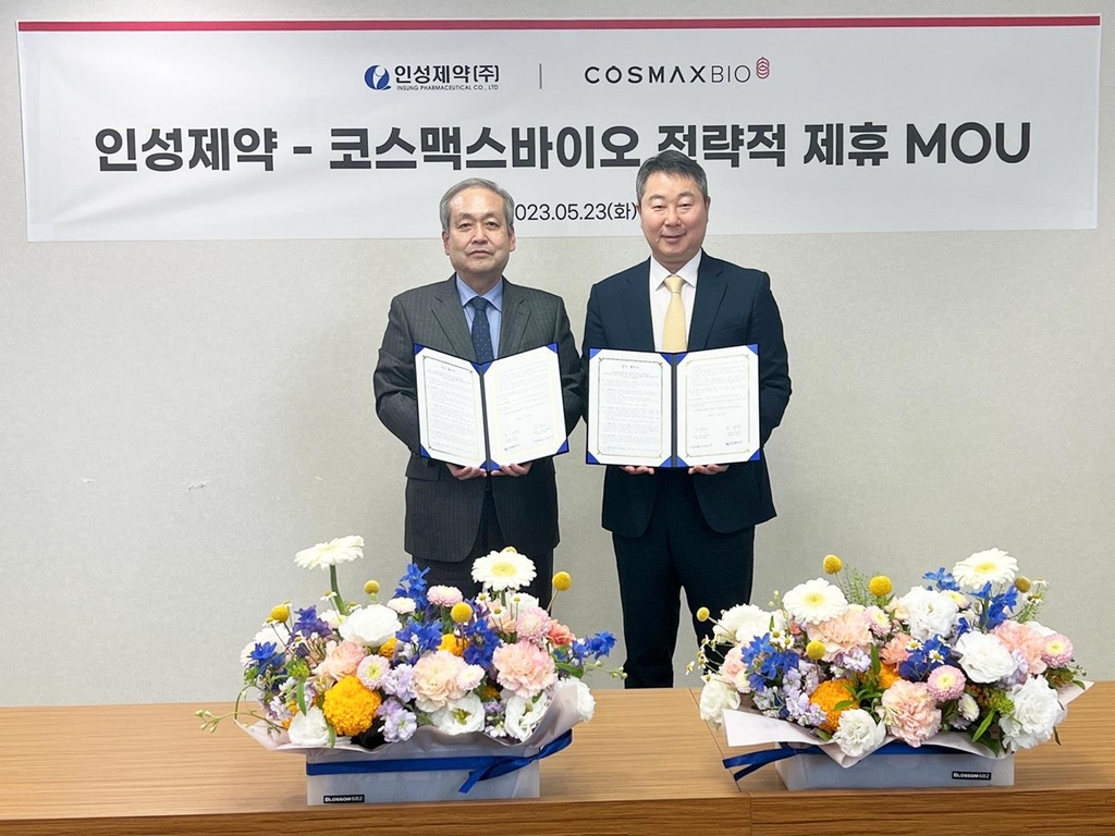 | ▲ 지난 23일 경기 성남시 코스맥스바이오 본사에서 열린 업무협약 체결식에서 김철희 코스맥스바이오 대표(오른쪽)와 도재정 인성제약 사장이 기념촬영을 하고 있다. [코스맥스바이오 제공. 재판매 및 DB 금지] |