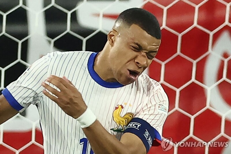 (서울=연합뉴스) 이영호 기자 = 코뼈가 부러진 프랑스 축구대표팀의 '골잡이' 킬리안 음바페(레알 마드리드)가 네덜란드와의 2024 유럽축구선수권대회(유로 2024) 조별리그 2차전에 결장할 전망이다.