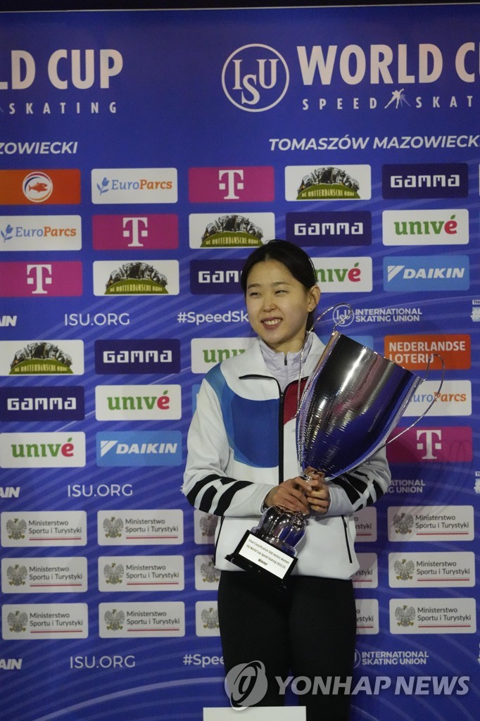 | ▲ In this Associated Press photo, South Korean speed skater Kim Min-sun poses with the Intenrational Skating Union World Cup trophy at Arena Lodowa in Tomaszow Mazowiecki, Poland, after finishing as the first overall in the women's 500 meters on Feb. 17, 2023. (Yonhap) |