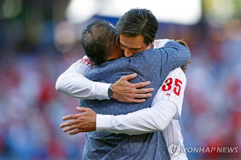 | ▲ 필라델피아 유니폼을 입고 시구한 콜 해멀스 2008년 필라델피아 필리스의 우승을 이끌었던 왼손 투수 콜 해멀스(오른쪽)가 22일(한국시간) 미국 펜실베이니아주 필라델피아 시티즌스 뱅크 파크에서 열린 2024 미국프로야구 메이저리그(MLB) 필라델피아와 애리조나 다이아몬드백스전을 앞두고 시구를 한 뒤 자신의 공을 받은 2008년 베터리 카를로스 루이스와 포옹하고 있다. 해멀스는 이날 은퇴식을 통해 공식적으로 선수 생활을 마감했다. [AFP=연합뉴스] |