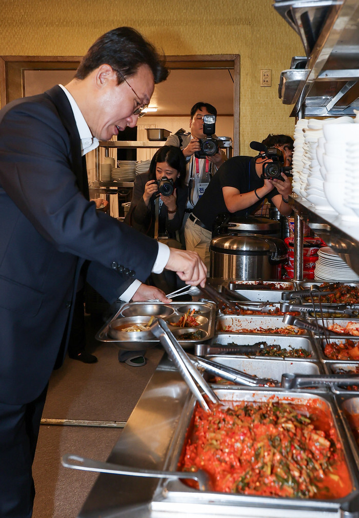 Prime Minister Kim Min-seok puts food on his tray at Manna Kimchi Restaurant in Cheongju, North Chungcheong Province, central South Korea, on Oct. 1, 2025, as he experiences the eatery's "breakfast priced at 1,000 won" (US$0.71). (Yonhap)