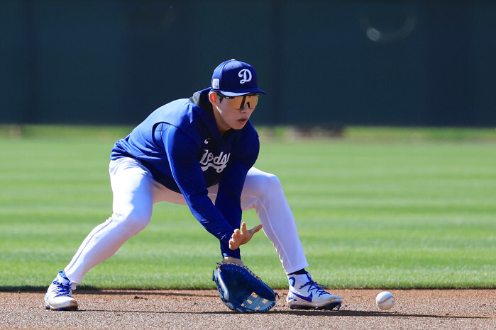 South Korean infielder Kim Hye-seong of the Los Angeles Dodgers trains at the team's spring training site at Camelback Ranch in Glendale, Arizona, on Feb. 19, 2025. (Yonhap)