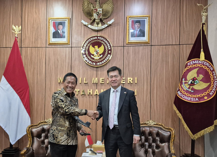 Seok Jong-gun (R), minister of South Korea's Defense Acquisition Program Administration, poses for a photo with Indonesian Deputy Defense Minister Donny Ermawan Taufanto during their meeting in Jakarta on March 21, 2025, in this photo released by the state arms procurement agency. (PHOTO NOT FOR SALE) (Yonhap)