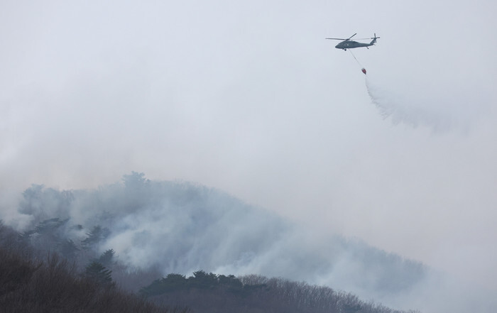 A Korea Forest Service helicopter dumps water on a mountain in the southeastern city of Ulsan on March 24, 2025, after a wildfire broke out two days ago. (Yonhap)