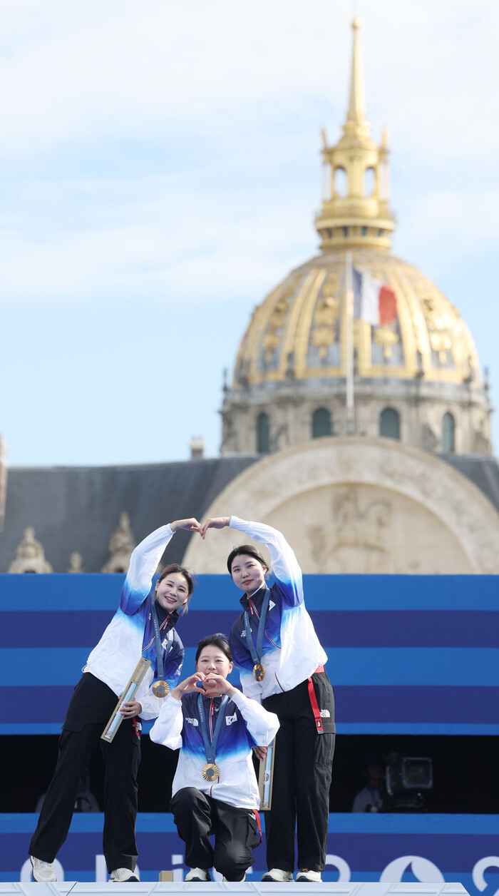 Jeon Hun-young, Lim Si-hyeon and Nam Su-hyeon of South Korea (L to R) celebrate winning the gold medal in the women's archery team event at the Paris Olympics at Invalides in Paris on July 28, 2024. (Yonhap)