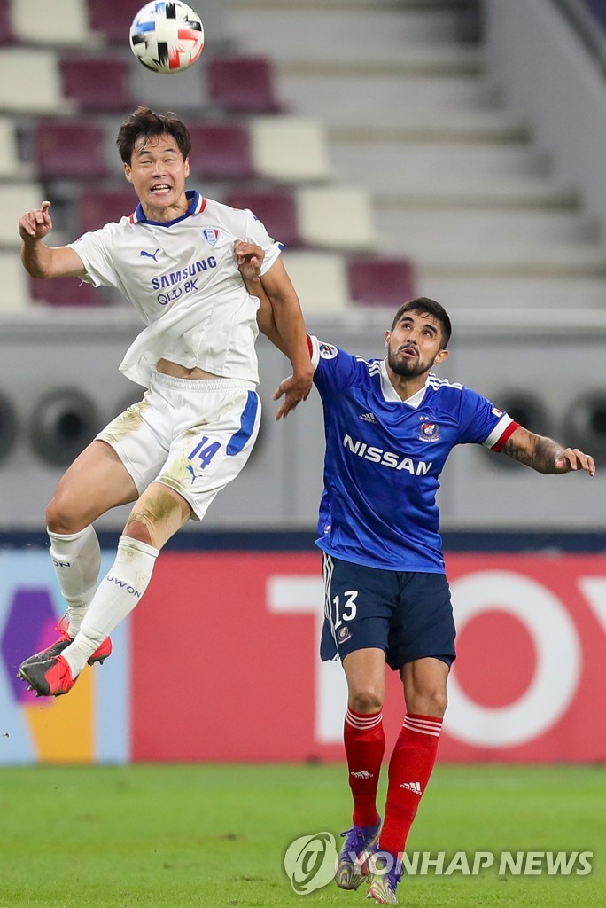 | ▲ In this Reuters photo, Lim Sang-hyub of Suwon Samsung Bluewings (R) is in action against Takahiro Ogihara of Yokohama F. Marinos in the round of 16 at the Asian Football Confederation Champions League at Khalifa International Stadium in Doha on Dec. 7, 2020. (Yonhap) |