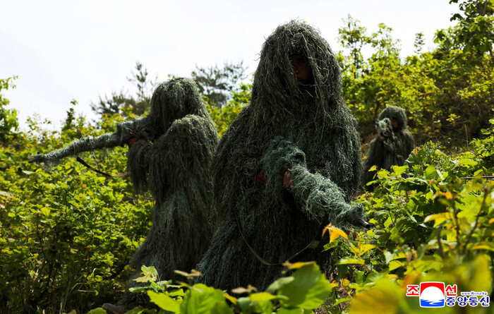 North Korean soldiers are dressed in camouflage as they take part in tactical drill demonstrations of different arms under the training course of the conference of training officers at a boot camp of the North Korean army's Capital City Defence Corps on May 13, 2025, in this photo released by the North's official Korean Central News Agency the next day. The North's leader Kim Jong-un watched the drill demonstrations, stressing that the most "crucial" task for the North's armed forces is to make full preparations for war. (For Use Only in the Republic of Korea. No Redistribution) (Yonhap)