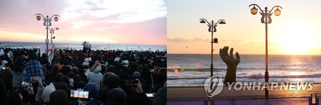 | ▲ 1년 새 바뀐 포항 호미곶 해맞이광장 풍경 (포항=연합뉴스) 손대성 기자 = 일출 명소인 경북 포항 호미곶 해맞이광장 풍경이 1년 사이에 확 달라졌다. 왼쪽은 2020년 1월 1일에 많은 해맞이 관광객이 몰렸을 때고, 오른쪽은 2021년 1월 1일 신종 코로나바이러스 감염증(코로나19) 확산을 우려한 포항시 통제로 관광객이 전혀 없을 때 모습. sds123@yna.co.kr |