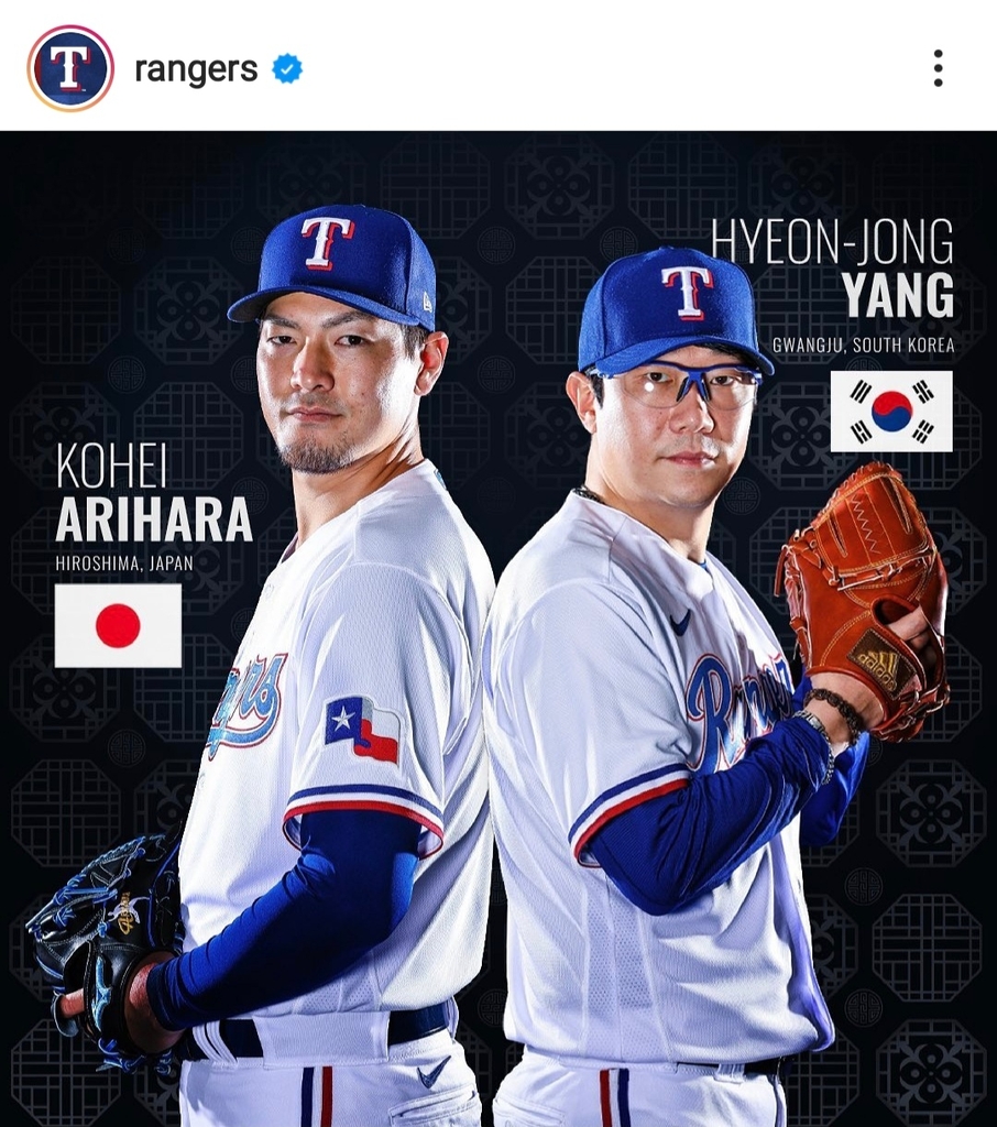 텍사스는 26일(한국시간) 인스타그램과 트위터 등 SNS에 "우리 구단을 대표하는 아시아 태생 선수들을 주목하고 싶다"며 양현종과 아리하라 고헤이(일본)가 나란히 포즈를 취한 사진을 올렸다.