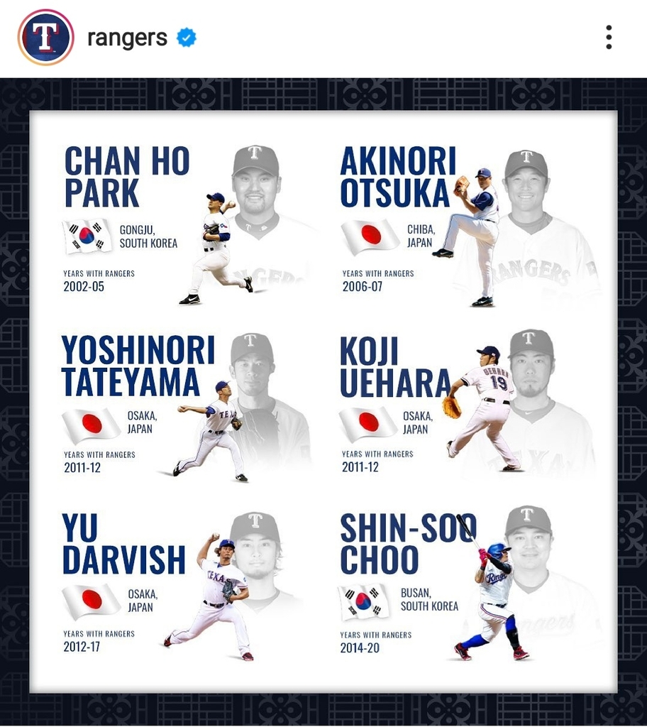 텍사스는 '한국 공주' 출신인 박찬호가 2002∼2005년, '한국 부산'에서 태어난 추신수는 2014∼2020년 이 구단에서 뛰었다고 설명했다.